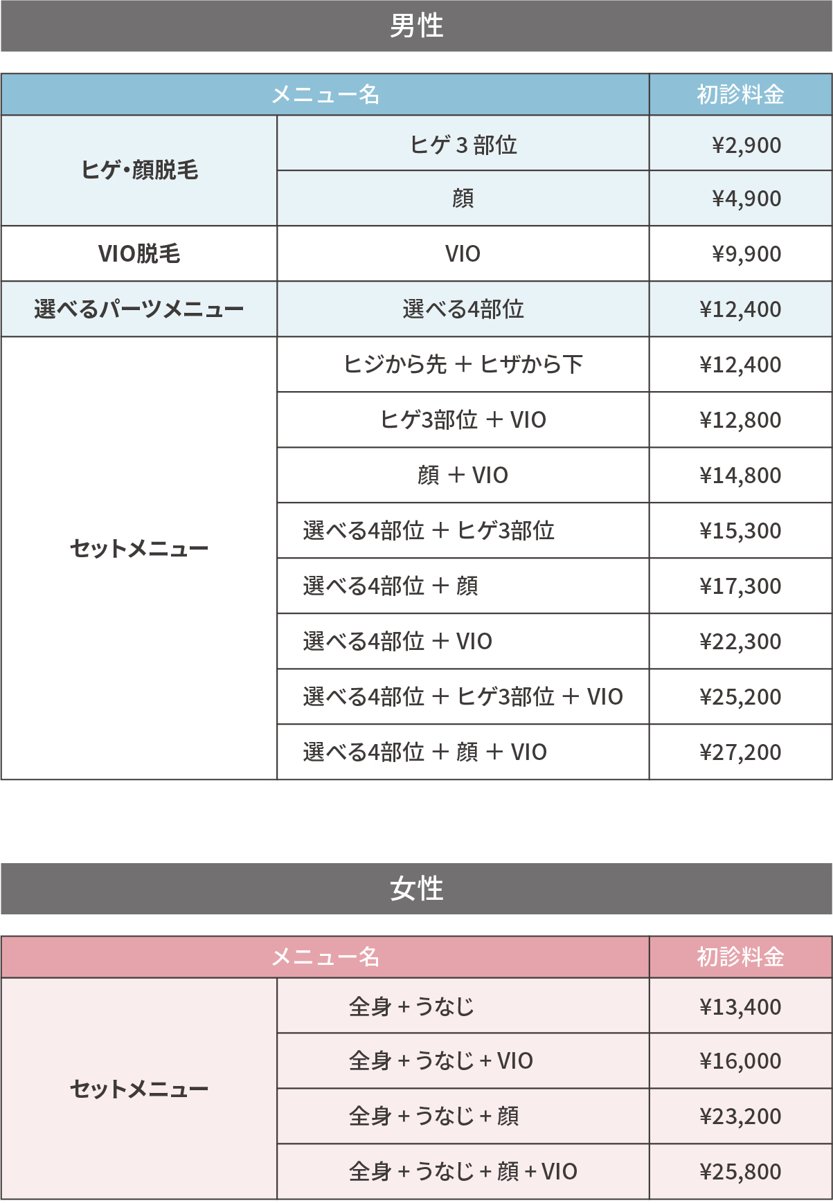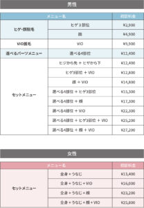 女性の料金メニュー