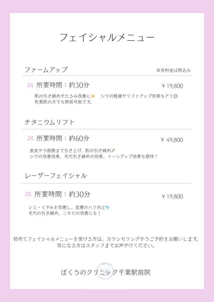 本日よりお肌のレーザー治療を開始いたしました。レーザー治療の開始に伴い、フェイシャルメニューの初回キャンペーンを実施いたします。当院ではじめてレーザー治療を受ける方に限り、以下の料金で施術を受けることができます。
