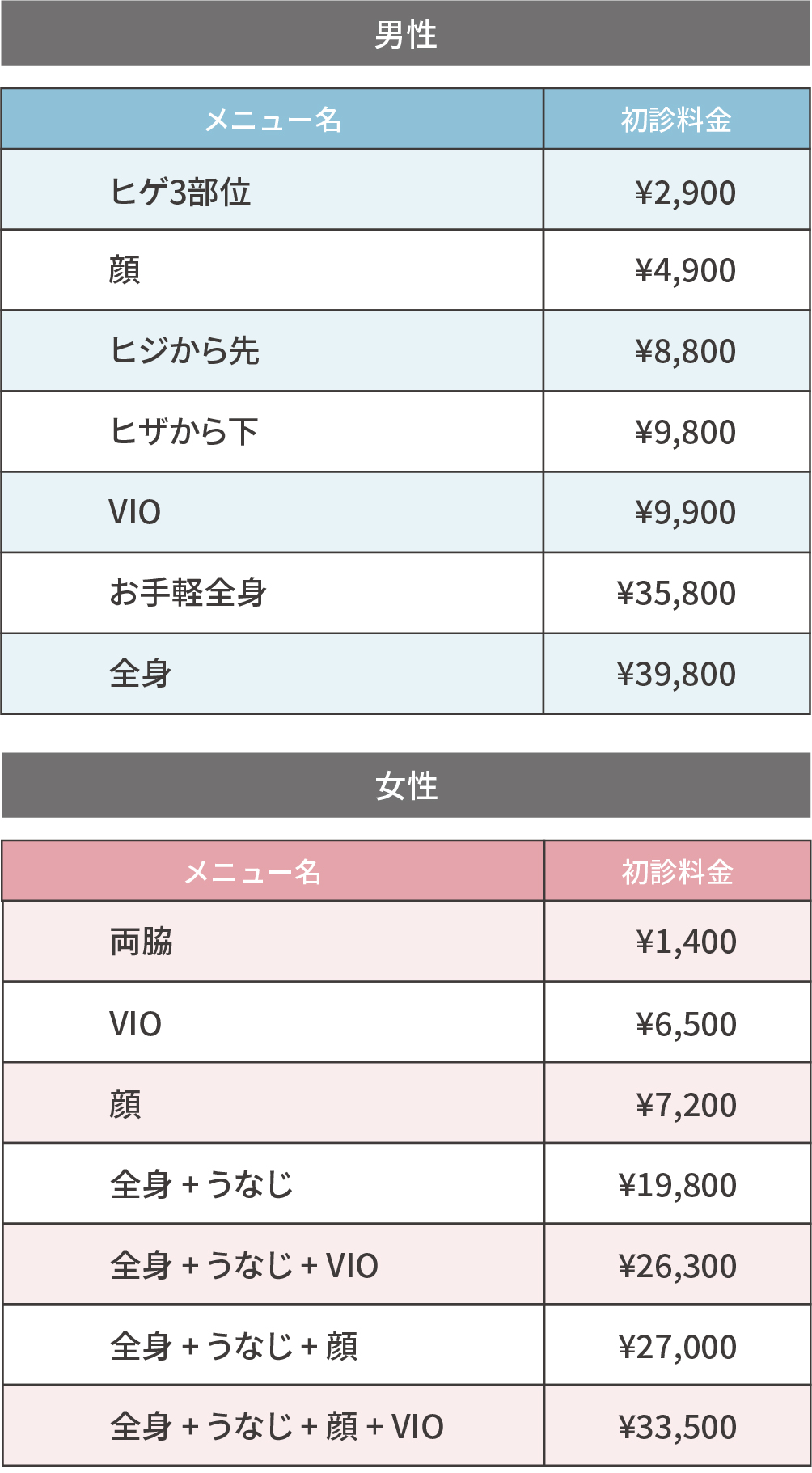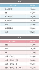 女性の料金メニュー